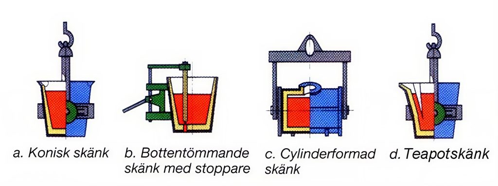 Skänkar i storlekar från små handhållna till stora mekaniskt hanterade är den vanligaste avgjutnings- och transportutrustningen för all typ av smälta.