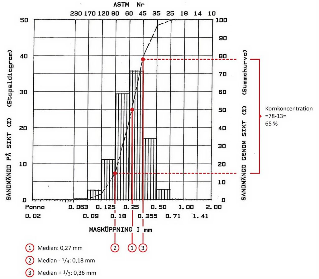Siktkurvan (kornfördelningskurvan) ger en bild av hur koncentrerad en sand är. Ett bättre mått på sandens koncentration är kornkoncentrationsgraden. Härmed avses den procentuella sandmängd som ligger inom intervallet 2/3 – 4/3 av mediankornstorleken (se diagrammet ovan).