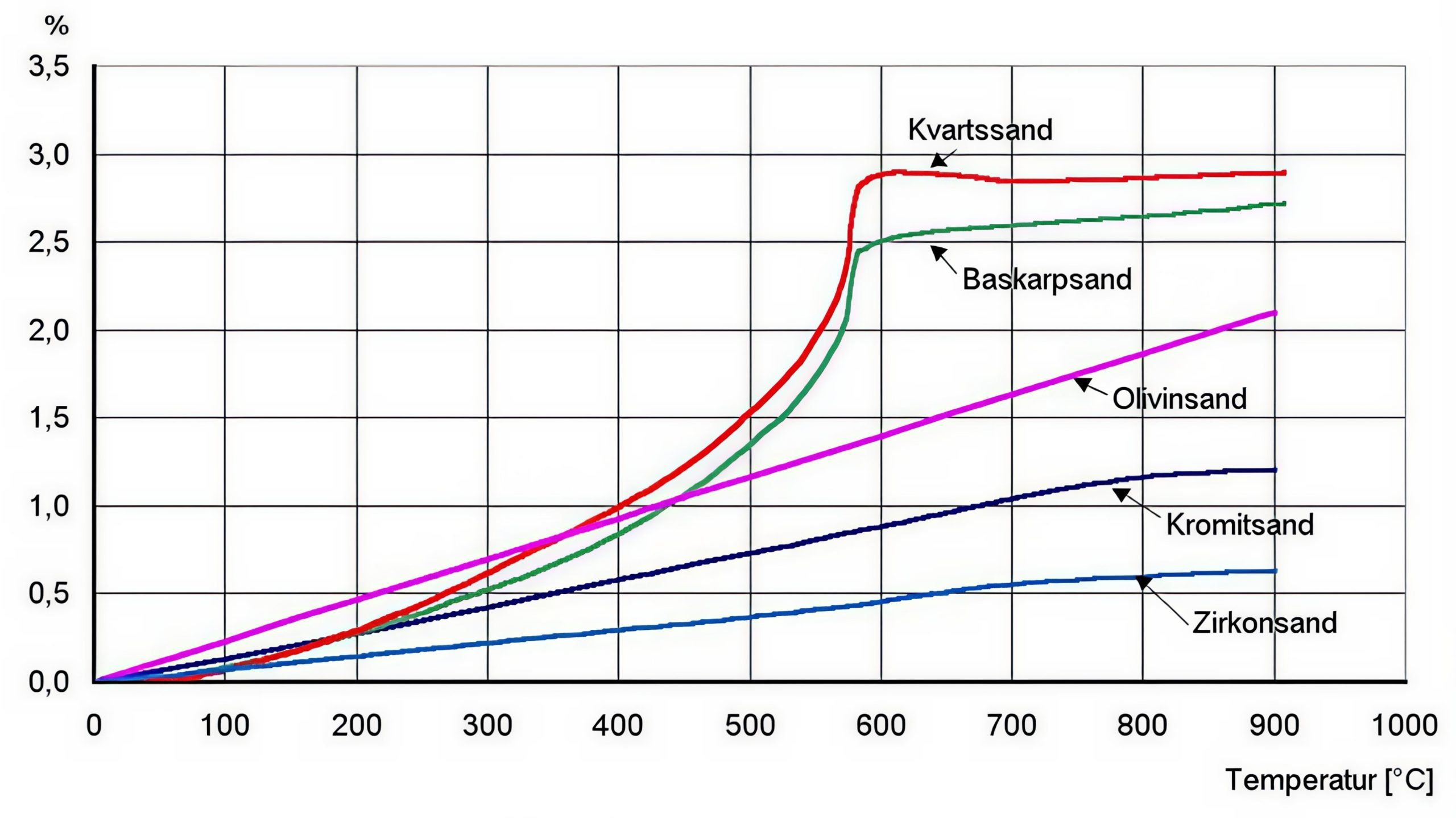 Figur 2. Termisk expansion som funktion av temperaturen för olika sander.
