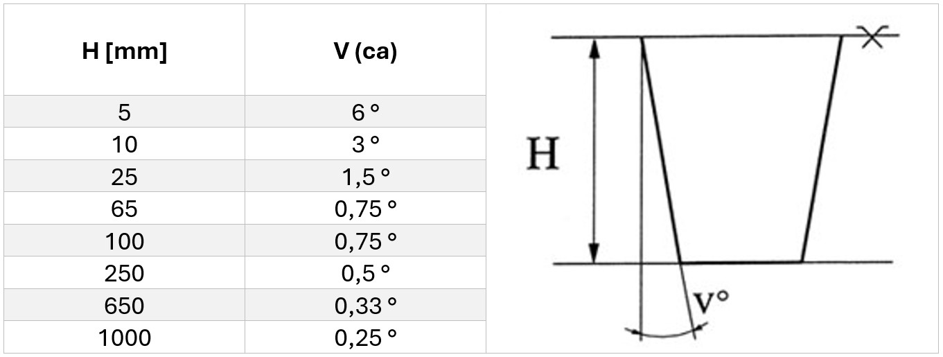 Även i kärnlådor måste finnas släppning för att underlätta urtagningen av kärnan. Rekommenderade släppningsvinklar framgår av tabellen nedan.