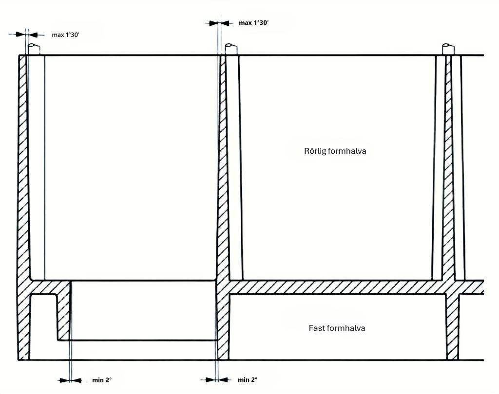 Figur 1. Pressgjutgodsstycke med mellanplan. Olika släppningsvinklar för den rörliga respektive fasta verktygshalvan.
