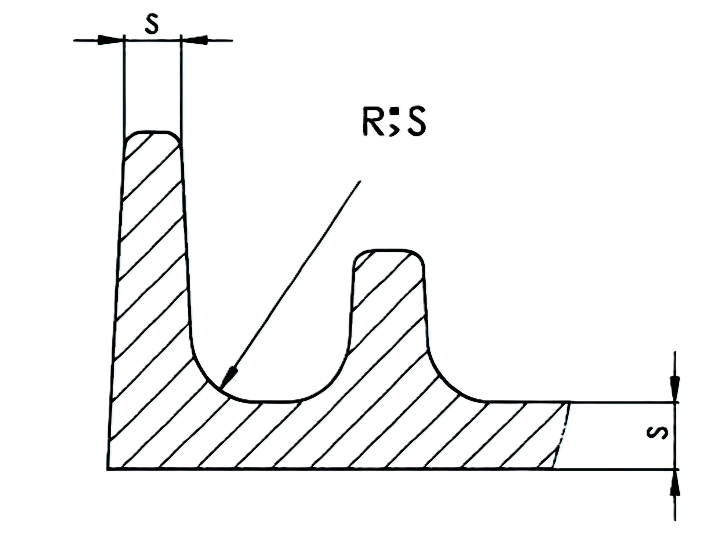 Tjockare väggtjocklekar kan ofta omkonstrueras till tunnväggig konstruktion med hjälp av förstärkningsribbor. Detta innebär inte bara en materialbesparing utan resulterar även garanterat i bättre struktur och högre specifik hållfasthet och därigenom en högre hållfasthet.