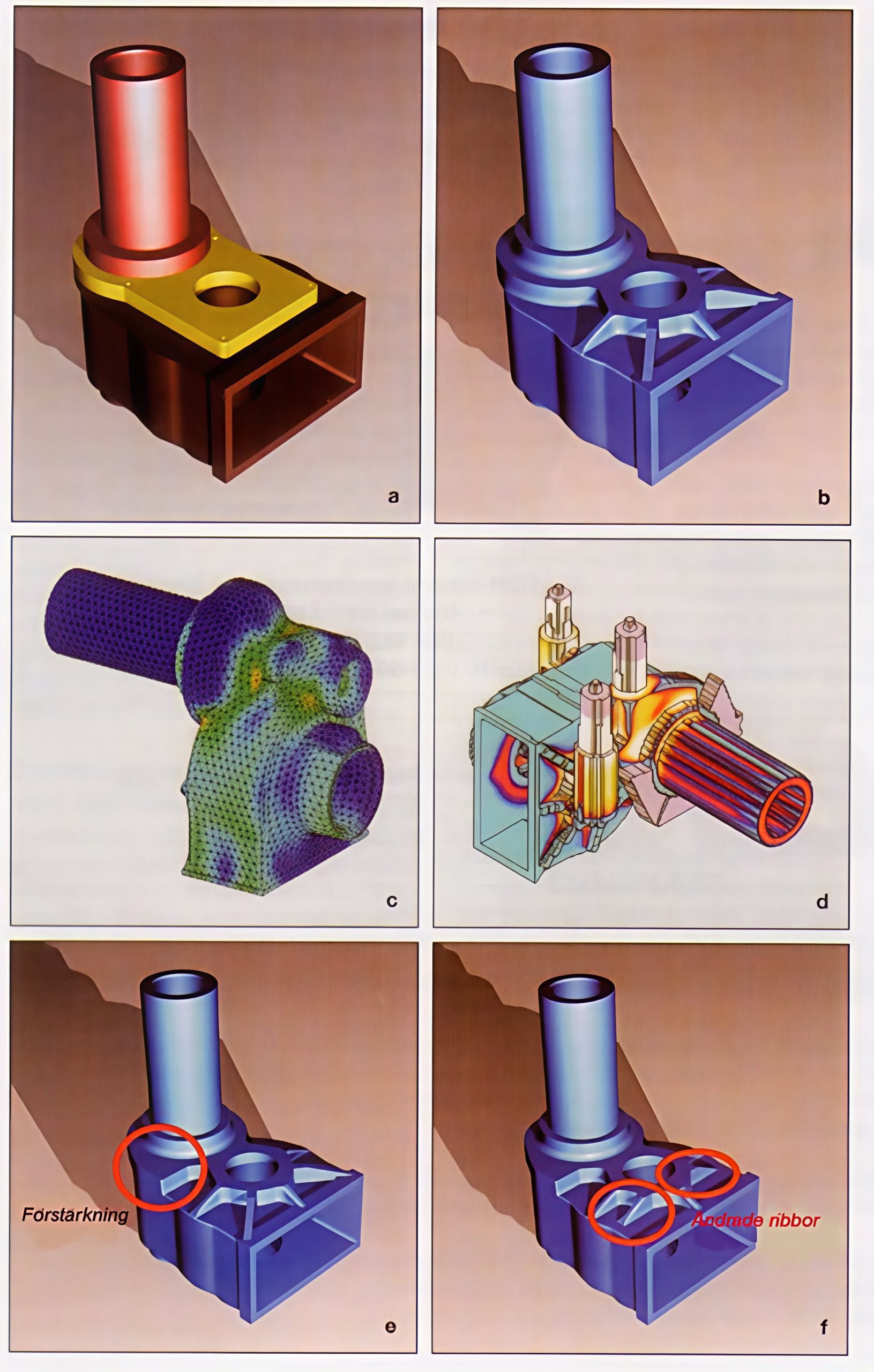 Vid kalkyler, som gjordes parallellt med konstruktionsarbetet, visade det sig att man genom att ändra läget för en yttre stödribba var möjligt att eliminera en yttre och dyrbar kärna. En förnyad FEM-beräkning visade att detta var möjligt utan att försämra hållfastheten (Figur 38f).