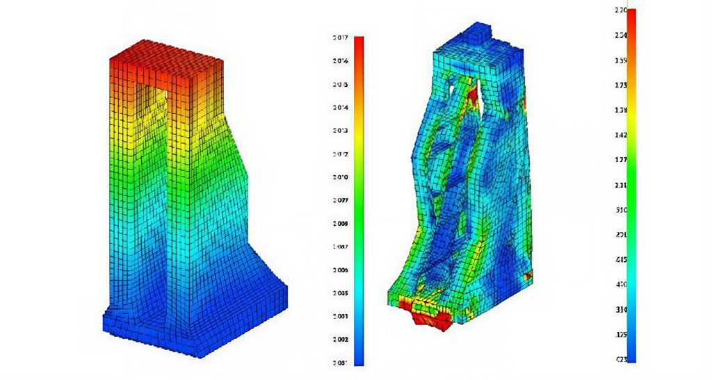 Figur 39. FEM-beräkningar för dimensionsavvikelser efter bearbetning.Dimensioner på stativet är 1 000 x 1 650 x 3 200 millimeter. Till vänster visas formändring vid massivt utförande medan den högra figuren visar ett FEM-nät vid optimerat utförande av geometrin.