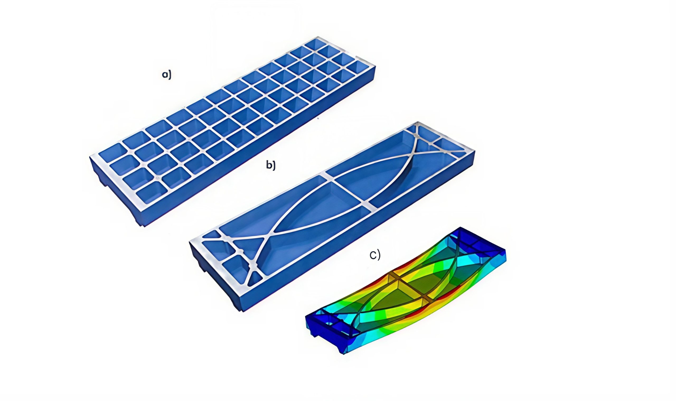 Släden utsätts vid drift för en acceleration på 2g. Den ursprungliga utformningen visas som a i Figur 41. Med omfattande manuella optimeringsberäkningar kombinerade med återkommande ändringar i CAD-modellen samt överföring av denna till FEM -beräkning kunde man finna en innovativ, överlägsen ribbutformning för släden (se Figur 41b nedan). Figuren (Figur 41c) visar också beräknad formändring hos släden vid belastning. Den ovanliga utformningen ger en i det närmaste optimal gjutbarhet. Kraven från modelltillverkare och gjuteri uppfylldes väsentligt mycket bättre än vid den lådformigt ribbförstärkta varianten. Genom optimering av utformningen av ribbförstärkningen uppnåddes 50 procent mindre formförändring än vid den ursprungliga utformningen. Vikten reducerades med 15 procent, vilket även medförde en sänkning av tillverkningskostnaden med 10 procent.