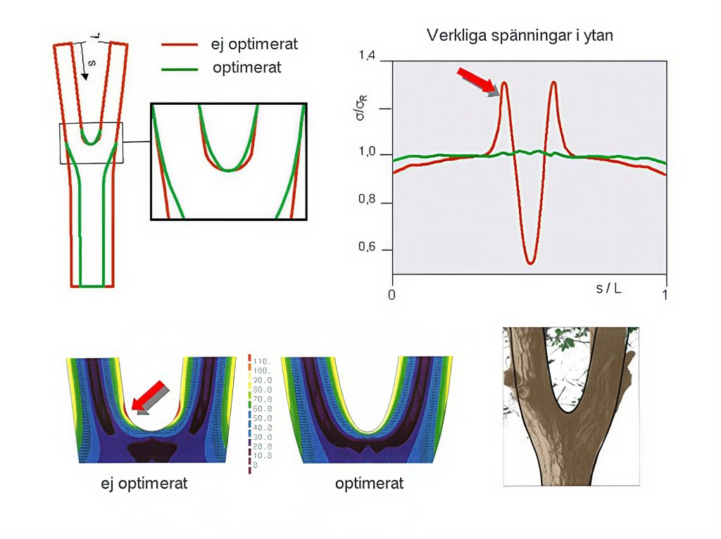 Ett exempel på detta är formoptimering av ett stöd som visas i Figur 43. I den övre delen av figuren visas i rött den ej optimerade utformningen och med grönt den optimerade utformningen av stödet. I detta exempel har optimeringsprogrammet jämfört spänningarna på komponentens yta med den önskade belastningsnivån. Utgående från skillnaden mellan dessa två värden, beräknas sedan mindre förskjutningar av komponentens yta. Denna process upprepas till dess att en konstant spänning uppnås i ytan. Detta gäller den gröna konturen i figuren. Materialet blir på detta sätt likformigt belastat i hela komponenten och uppvisar varken höga anvisningsspänningar eller dåligt utnyttjade överdimensionerade områden (nedre delen av figuren). Den optimerade konturen har stor likhet med den till höger i figuren visade trädklykan.