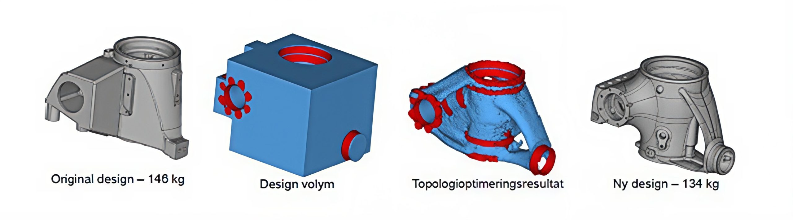Figuren nedan visar hur topologioptimeringen kunde reducera vikten med nio procent. Samtidigt ökade lyftkapaciteten med tre procent. Beräkningsgeometrin i detta fall hade tolv lastfall att ta hänsyn till för att genomföra optimeringen.